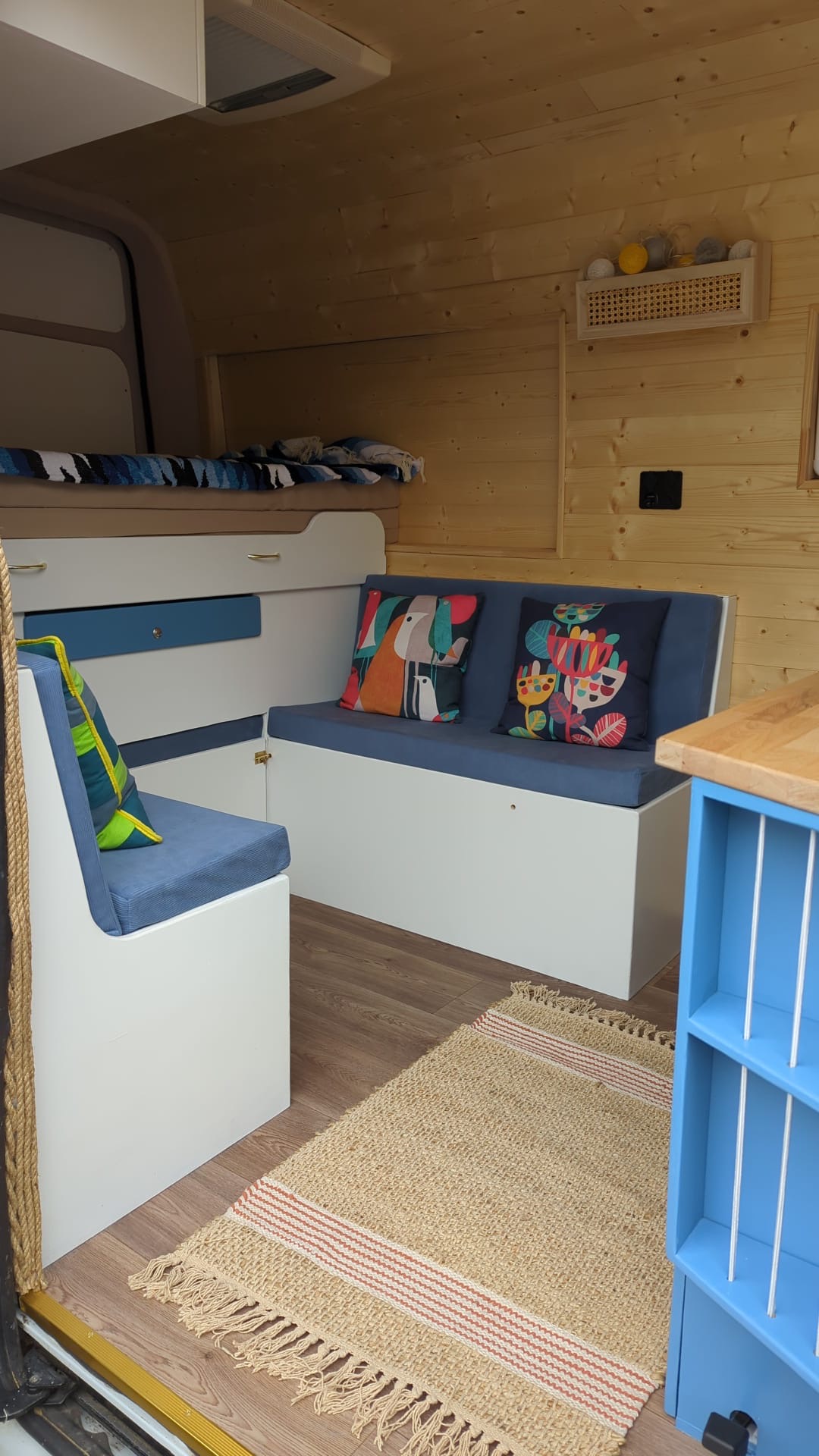 Intérieur du Peugeot Boxer avec banquette /rangement, transformable en lit enfant.