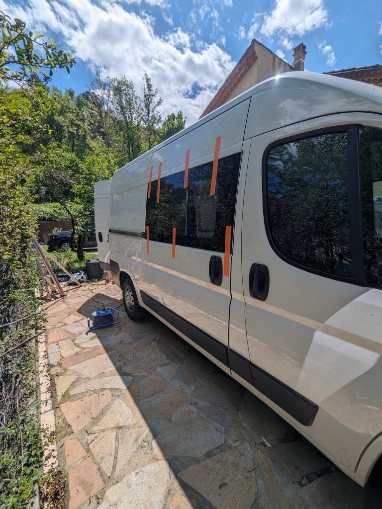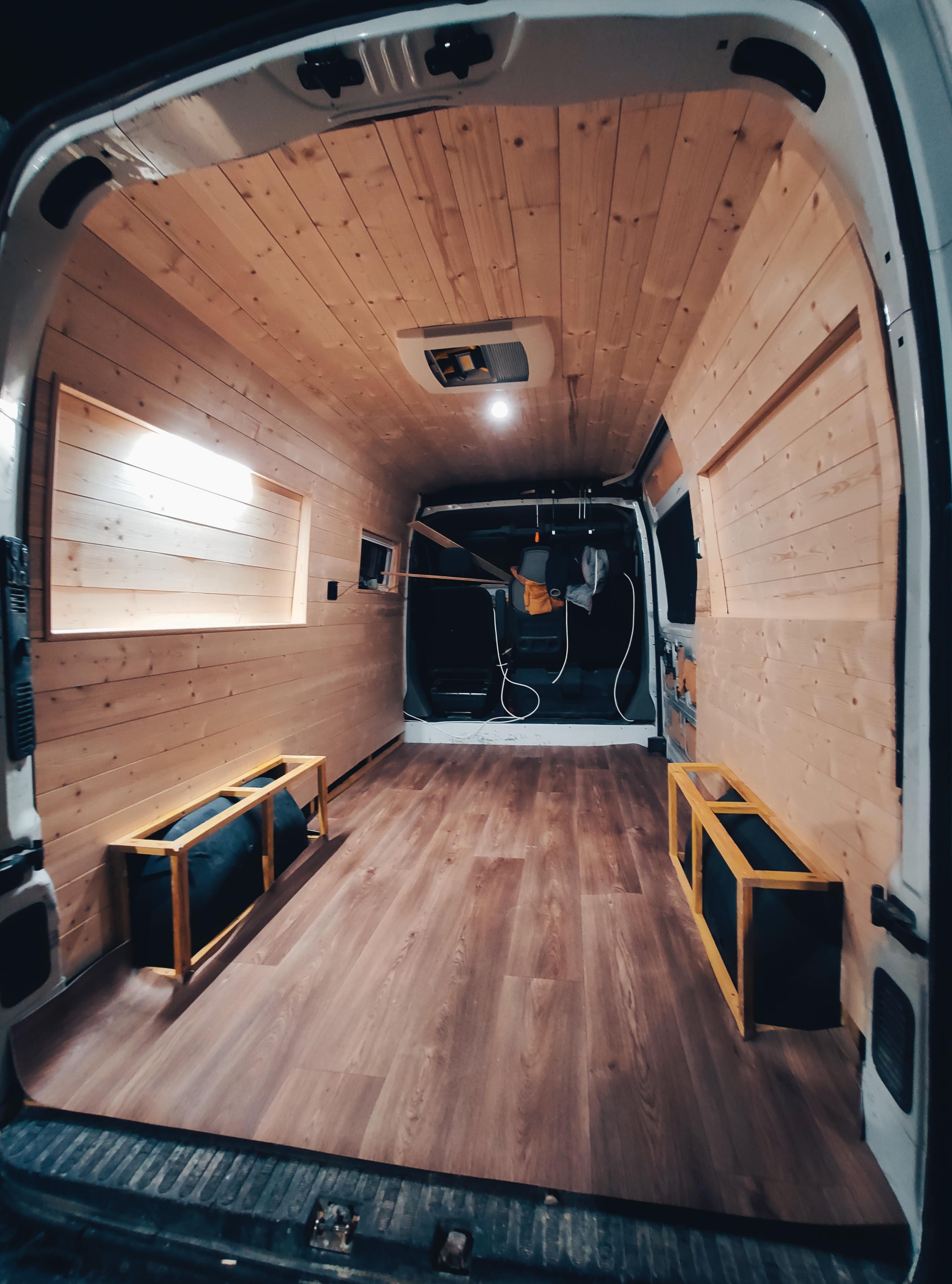 Création du coin lit/ repas dans le Nissan Nv 400. Pose d’un hublot au plafond.