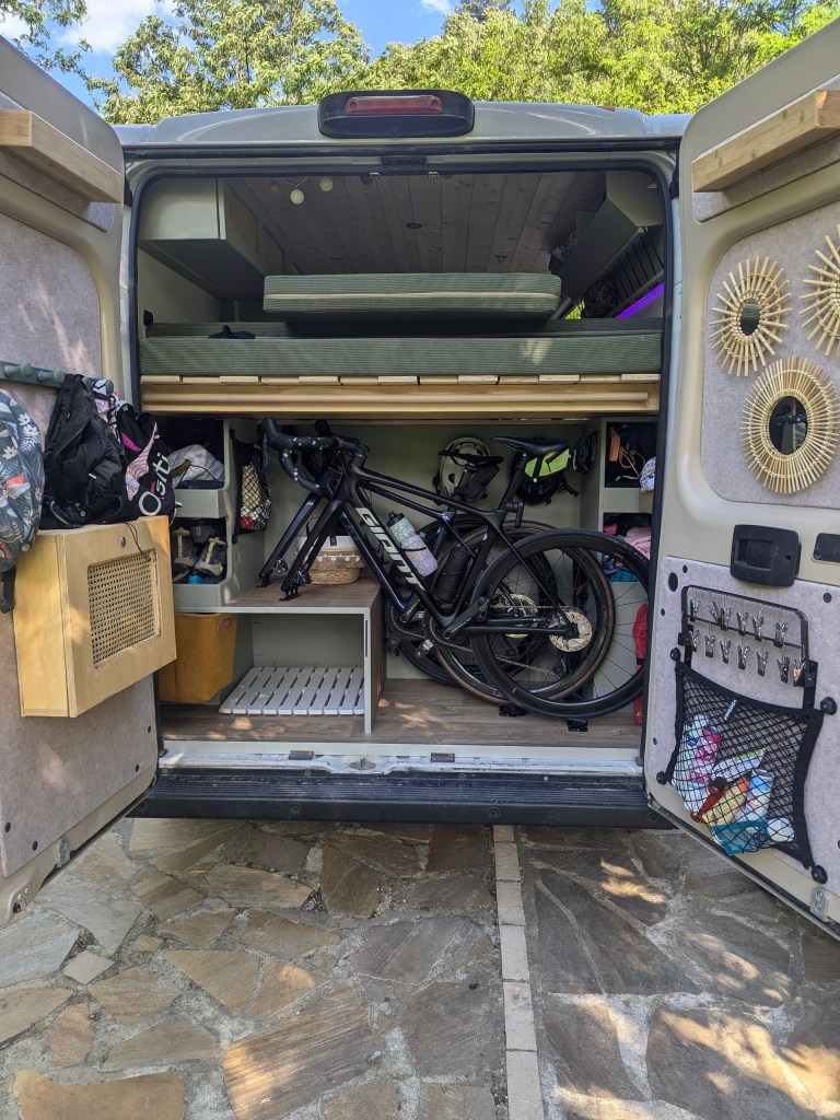 Système de rangement pour vélos à l’arrière du van. avec casier sur le coté gauche pour ranger la poussette Thule.
